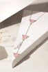 Made of 925 sterling silver with a white gold (rhodium) plating and finished with 18k goldfilled, this necklace features three triangular-cut fusion rose quartz stones, evoking purity and harmony. The long and delicate chain creates a graceful silhouette that beautifully highlights the neckline.